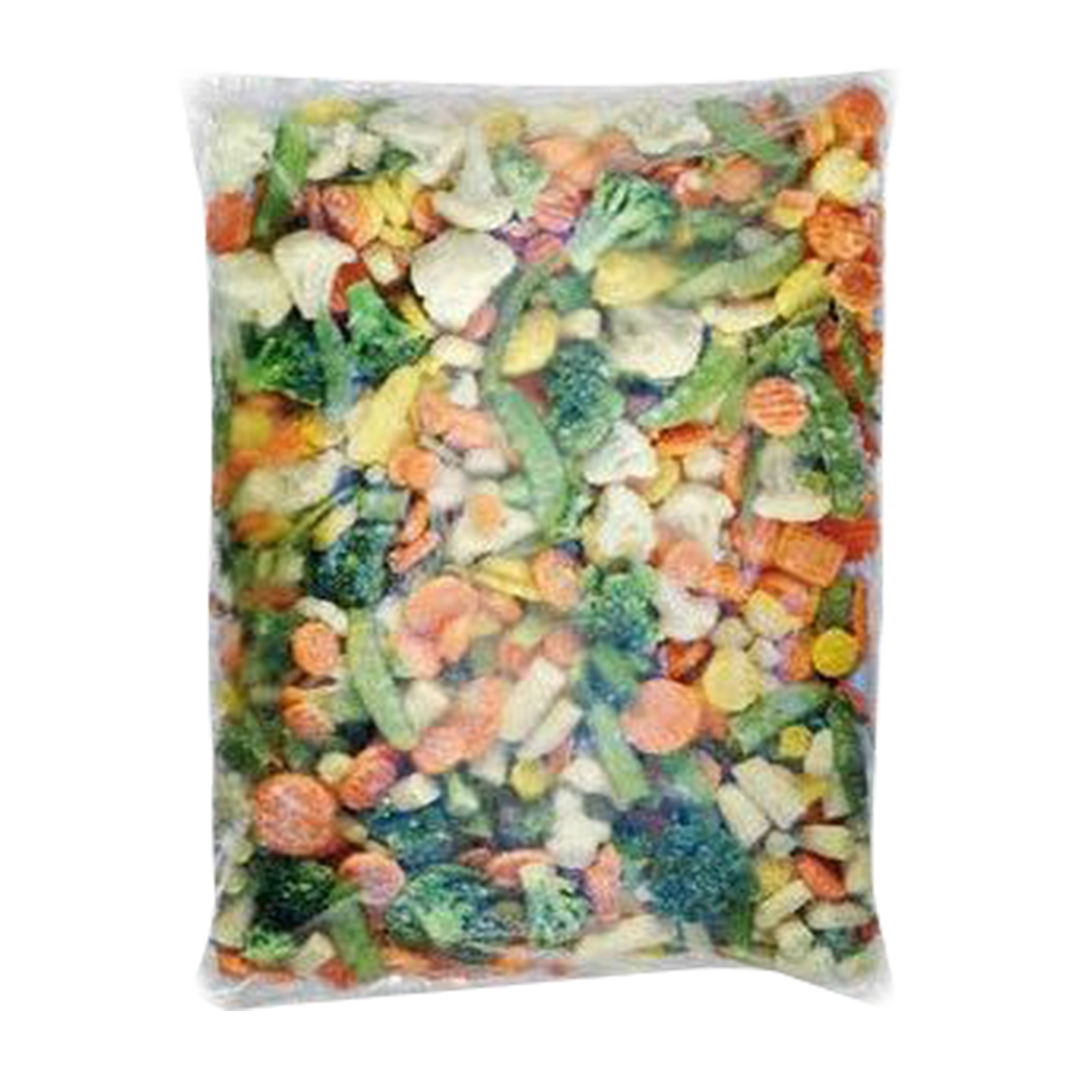 Mrkev červená a žlutá orient, květák růžičky, brokolice růžičky, kukuřice mini kostky, hráškové lusky